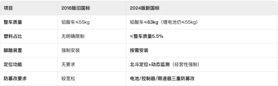 9 月 1 日,电动自行车新国标正式实施。根据新国标规定:今日起生产的电动自行车,锂电池电动自行车限重 55 公斤,铅酸蓄电池车型限重从 55 公斤提高到 63 公斤。完善控制器的防篡改要求,车速超过每小时 25 公里,电机将不再提供动力。要求塑料材质占整车重量比例不得超过 5.5%,减少火灾风险;鼓励安装后视镜,减少「回头率」。